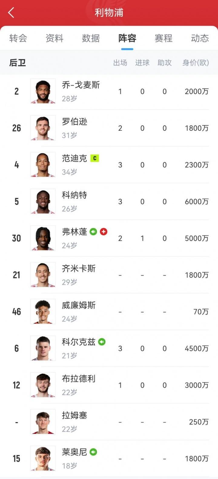 利物浦防线球员情况: